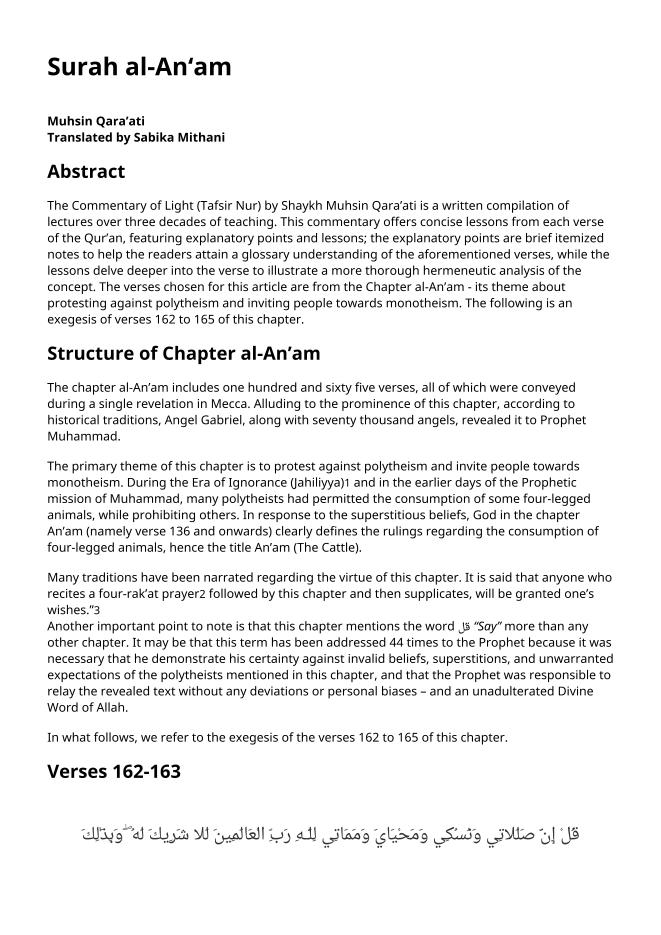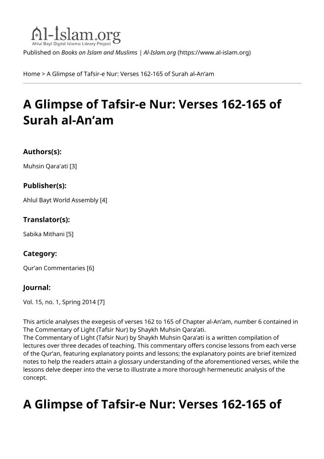 A Glimpse Of Tafseer E Noor- Verses 162 165 Of Surah Al Anam Muhsin Qaraati English Translation | Hidayat Library - Offers a vast collection of Shia Islamic books